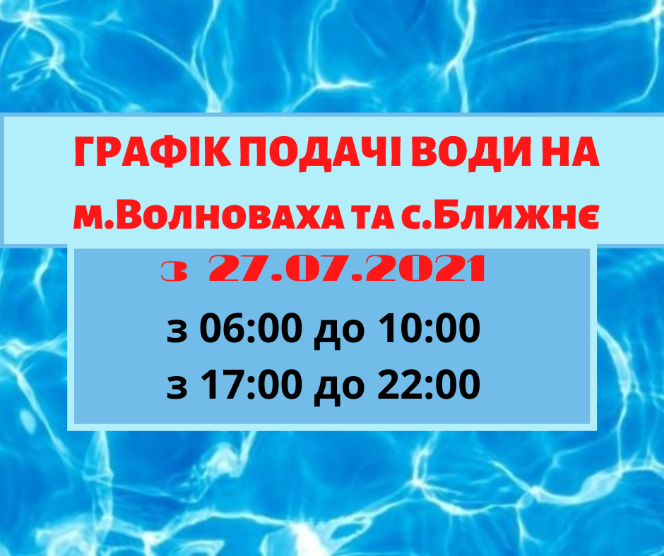 У ЗВ’ЯЗКУ З ЦИМ, ВОЛНОВАСЬКЕ ВУВКГ ВИМУШЕНО З 27.07.2021 Р. ПЕРЕЙТИ НА ГРАФІКОВУ ПОДАЧУ ВОДИ ДО М. ВОЛНОВАХА ТА С. БЛИЖНЄ.
