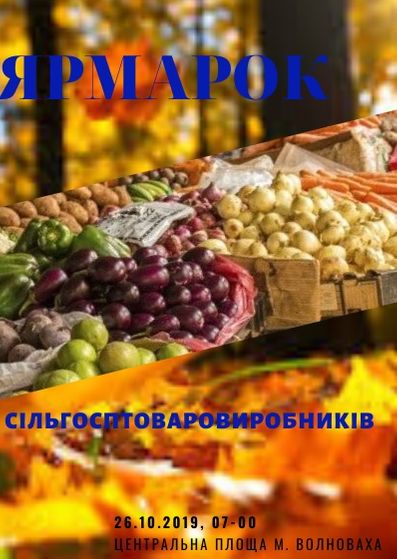 26 жовтня о 07-00 на центральній площі м. Волноваха розпочнеться ярмарок вихідного дня сільгосптоваровиробників Волноваського району. До участі у ярмарку запрошуються сільськогосподарські товариства, фермерські господарства і переробні підприємства. Торгівля проводитиметься без оплати за місце.