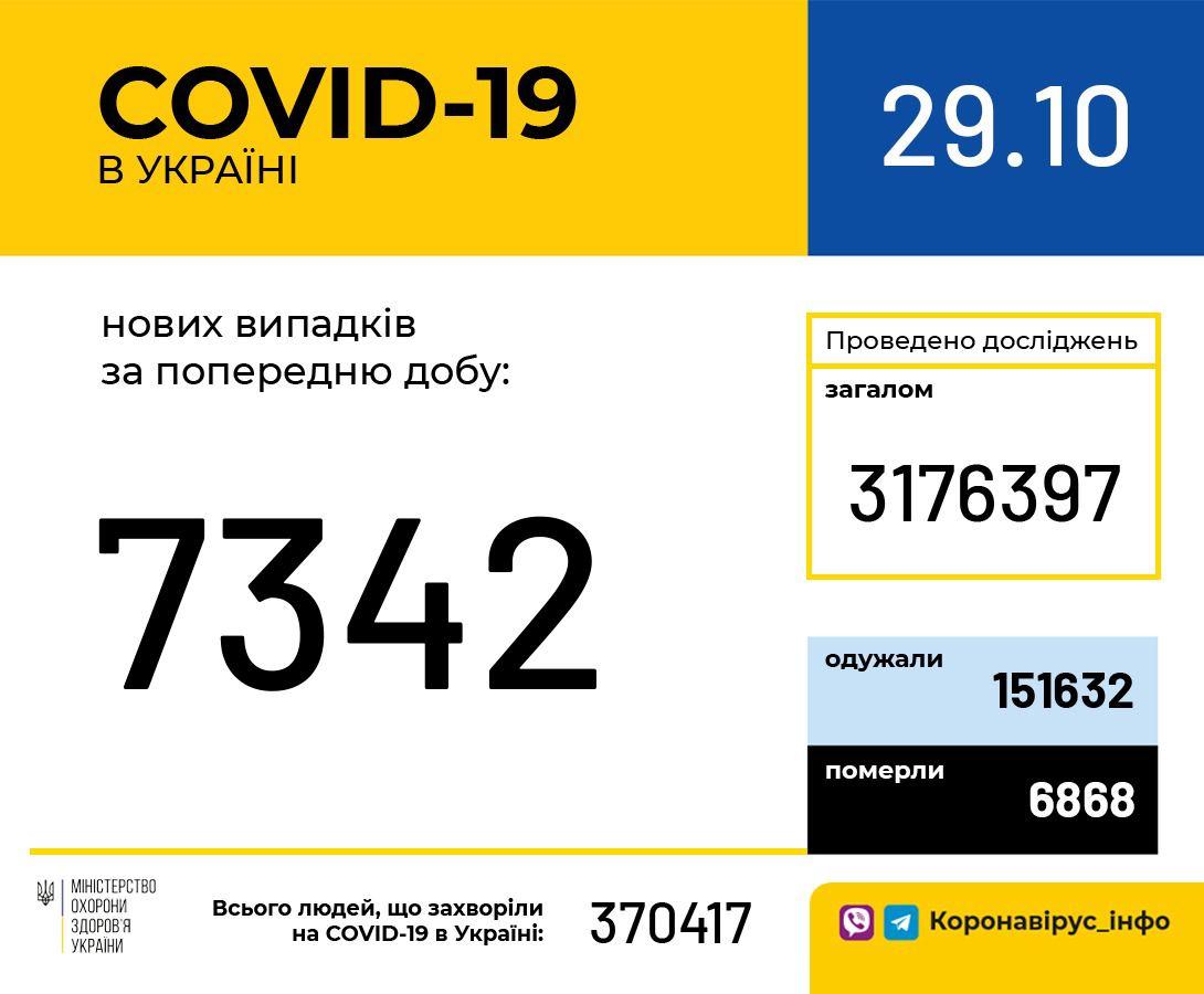 29 жовтня (станом на 9:00) в Україні 370 417 лабораторно підтверджених випадків COVID-19, із них 6 868 летальних, 151 632 пацієнти одужали. За добу зафіксовано