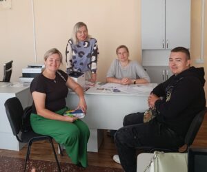 Ветеран Максим Ніколайчук разом із фахівчинею супроводу ветеранів війни Юлією Ілляш (зліва від Максима) в Центрі зайнятості. Фото: Центр підтримки ветеранів війни Баришівської громади Київської області